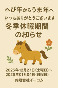 平素は格別のご高配を賜り、厚く御礼を申し上げます。 さて、弊社では、誠に勝手ながら本年度の冬季休暇を下記の日程とさせていただきます。 2025年12月27日(土曜日) ~ 2026年01月04日(日曜日) ※2025年1 […]