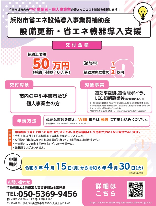 浜松市省エネ設備導入支援補助金 2024年4月12日 最終更新日時 : 2024年4月12日 yagasan 浜松市の中小事業者及び個人事業者対象で設備更新に対する省エネ機器の導入補助金が始まります。内容は下記のとうりです。 https://www.shouenesetsubi.city.hamamatsu.shizuoka.jp/chu FacebookXBlueskyHatenaCopy